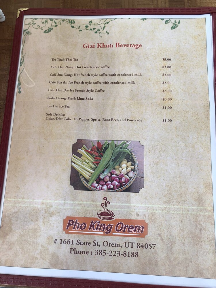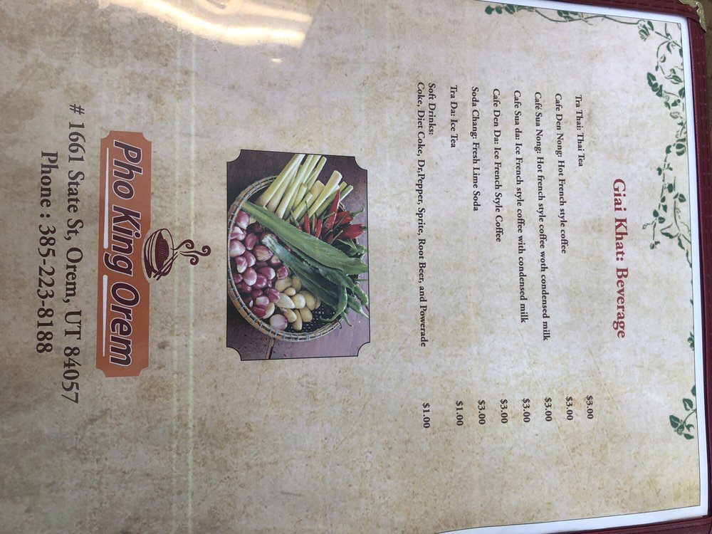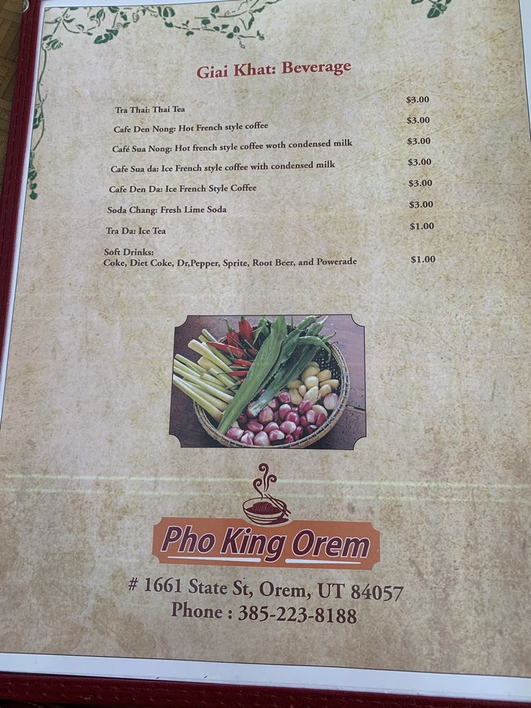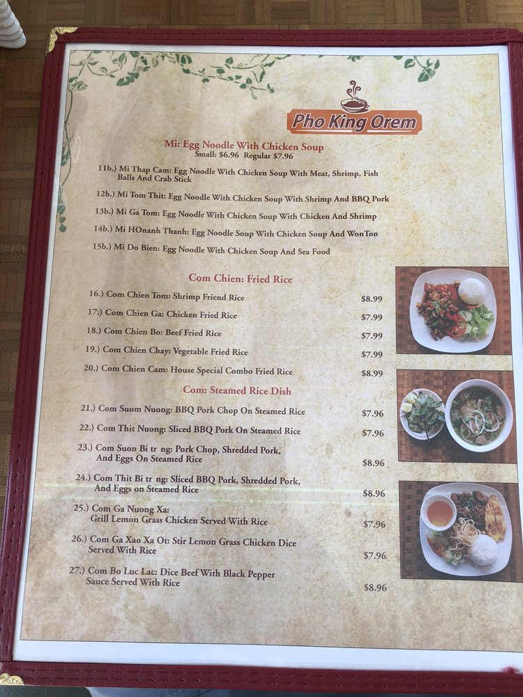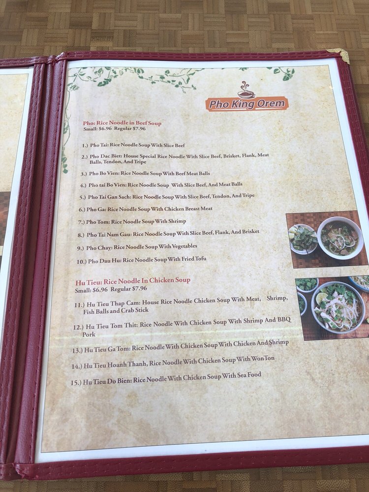 Introducing the menu at Pho King Orem, a Vietnamese restaurant in Orem, UT. With a diverse range of offerings, including vegan and vegetarian options, this casual eatery is perfect for any occasion. Customers rave about the authentic flavors and generous portions, particularly praising the delicious chicken broth cooked for 15 hours. The staff is attentive and accommodating, ensuring a pleasant dining experience. Standout dishes include the traditional pho with thick slices of tender meat and an abundance of toppings. Despite facing competition from chain restaurants, Pho King Orem stands out for its quality and affordability. Whether you're looking for a quick lunch or a relaxed dinner, this restaurant is a must-visit for lovers of Vietnamese cuisine. Don't miss out on the opportunity to support a local business and treat yourself to a satisfying bowl of pho at Pho King Orem.