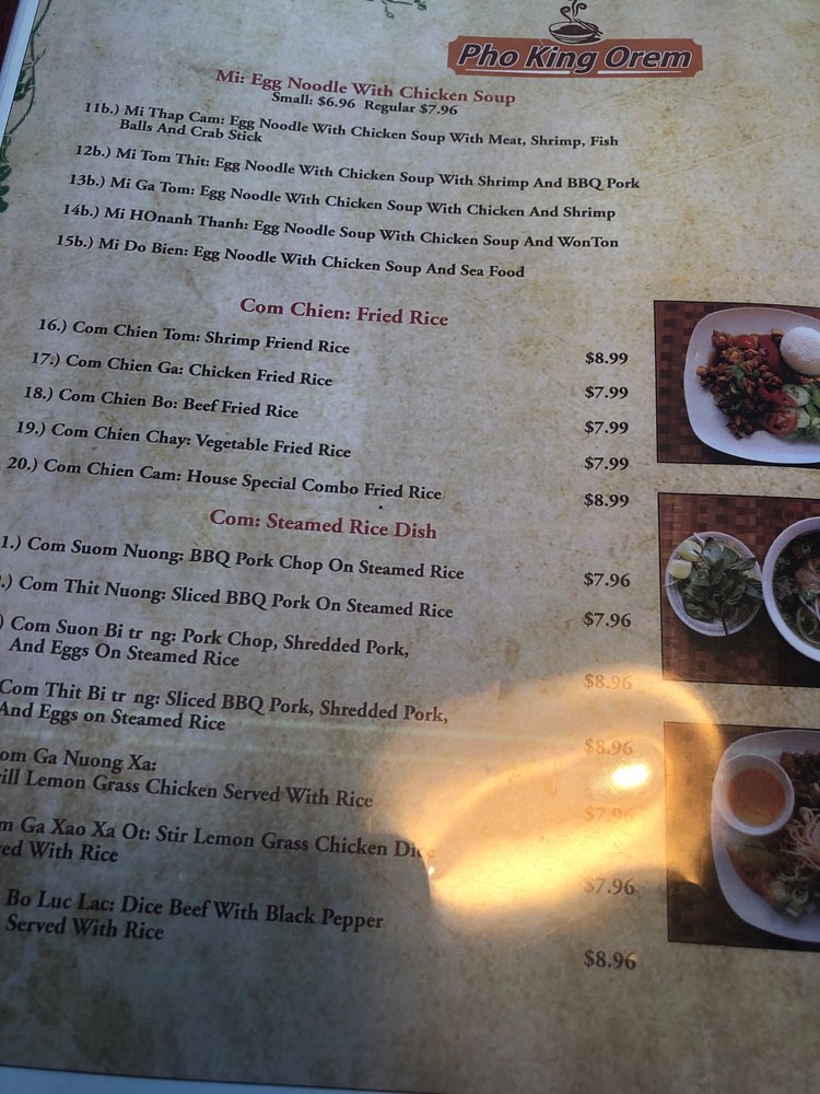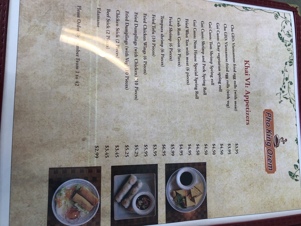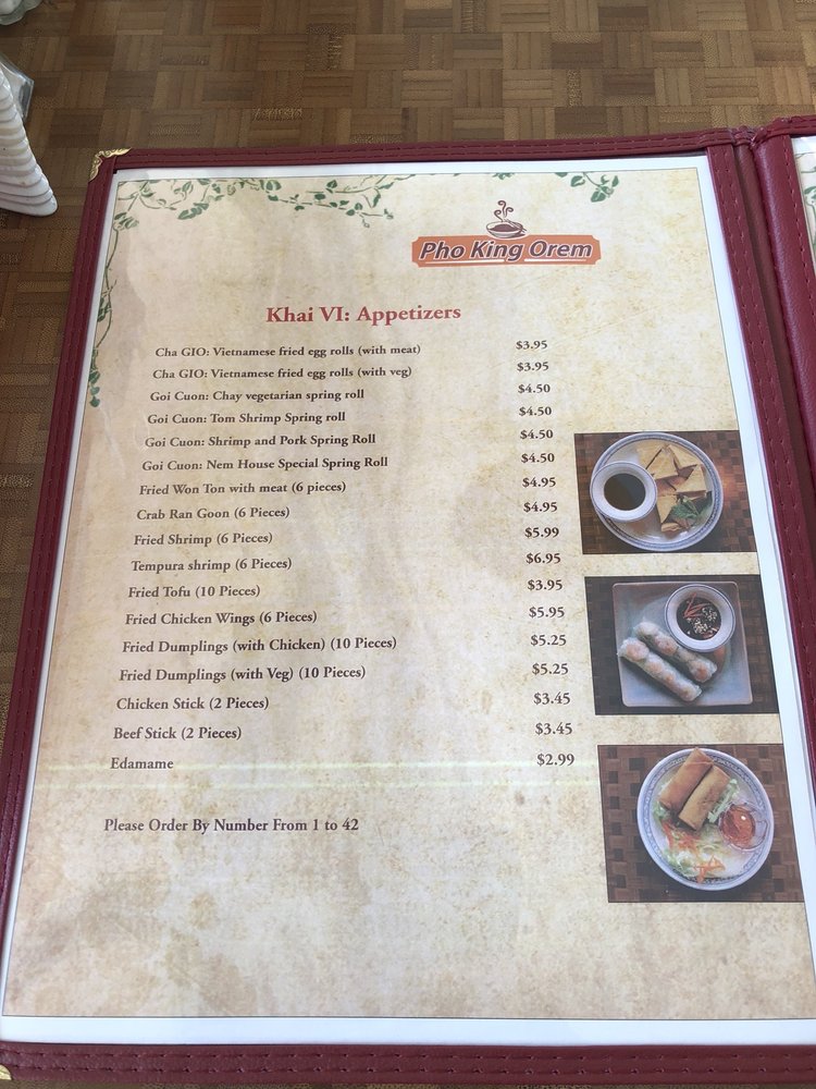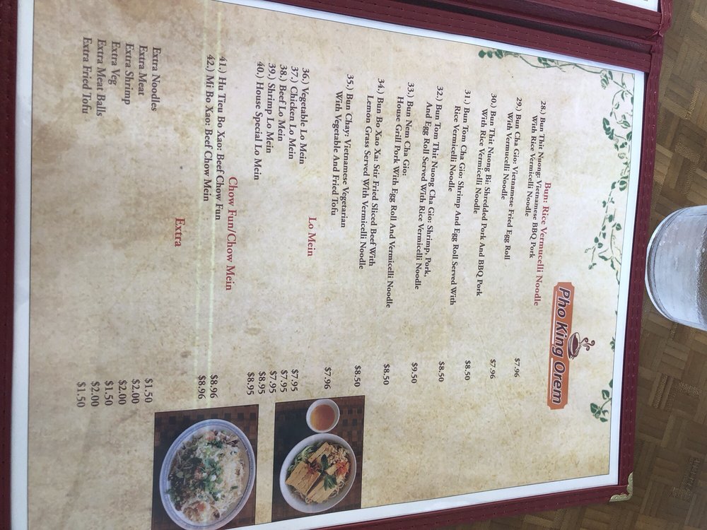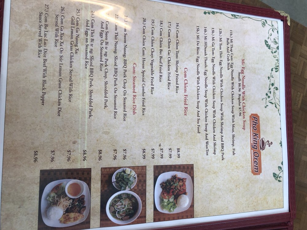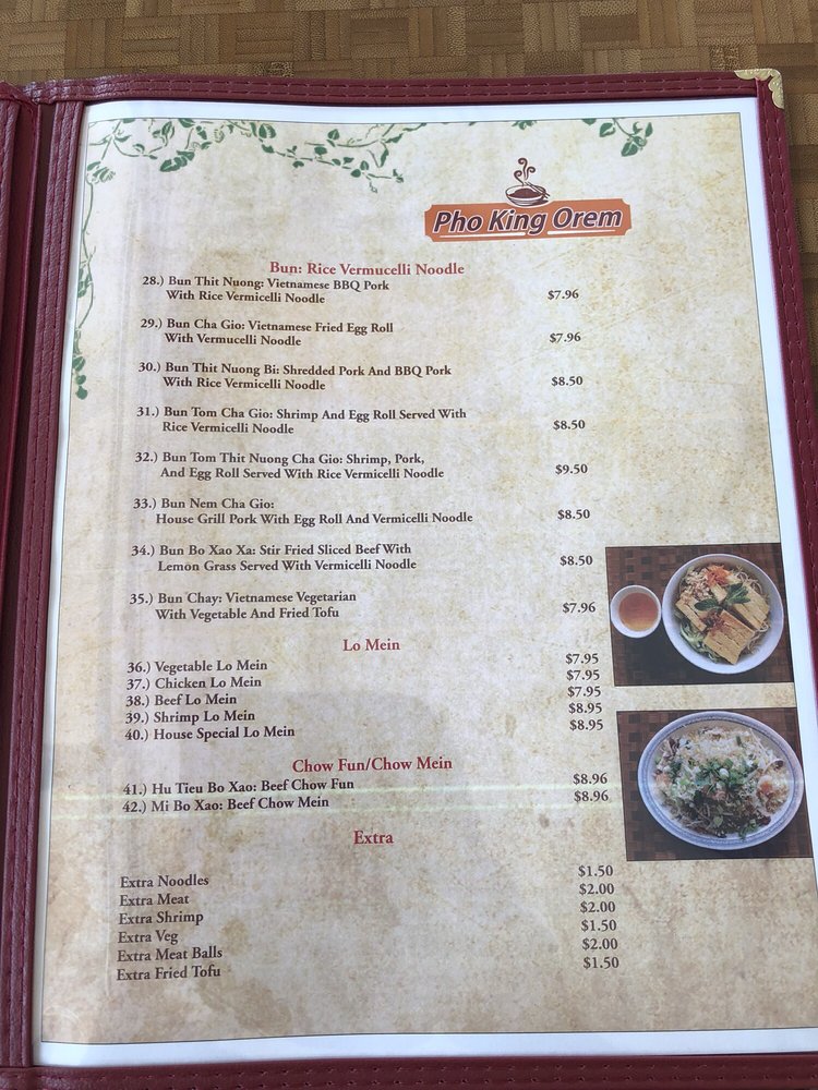 Introducing the menu at Pho King Orem, a Vietnamese restaurant in Orem, UT. With a diverse range of offerings, including vegan and vegetarian options, this casual eatery is perfect for any occasion. Customers rave about the authentic flavors and generous portions, particularly praising the delicious chicken broth cooked for 15 hours. The staff is attentive and accommodating, ensuring a pleasant dining experience. Standout dishes include the traditional pho with thick slices of tender meat and an abundance of toppings. Despite facing competition from chain restaurants, Pho King Orem stands out for its quality and affordability. Whether you're looking for a quick lunch or a relaxed dinner, this restaurant is a must-visit for lovers of Vietnamese cuisine. Don't miss out on the opportunity to support a local business and treat yourself to a satisfying bowl of pho at Pho King Orem.